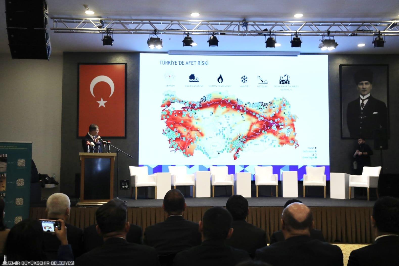 Risk azaltım ve afetle mücadele planlarının yalnızca merkezi yönetimin değil, yerel yönetimlerin de sorumluluğunda olduğunu vurgulayan Başkan Tugay, iklim krizine dikkat çekti. Tugay, “Depremler ve orman yangınları kısa vadede ciddi sorunlar gibi görünse de yaşadığımız en büyük kriz iklim krizidir. Kuraklık, aşırı sıcak hava dalgaları, toplum sağlığına etkiler, tarıma yansımasıyla oluşabilecek gıda krizi ve ekosistem tahribatı bizi çölleşmiş bir ülkeye doğru götürüyor” diye konuştu.