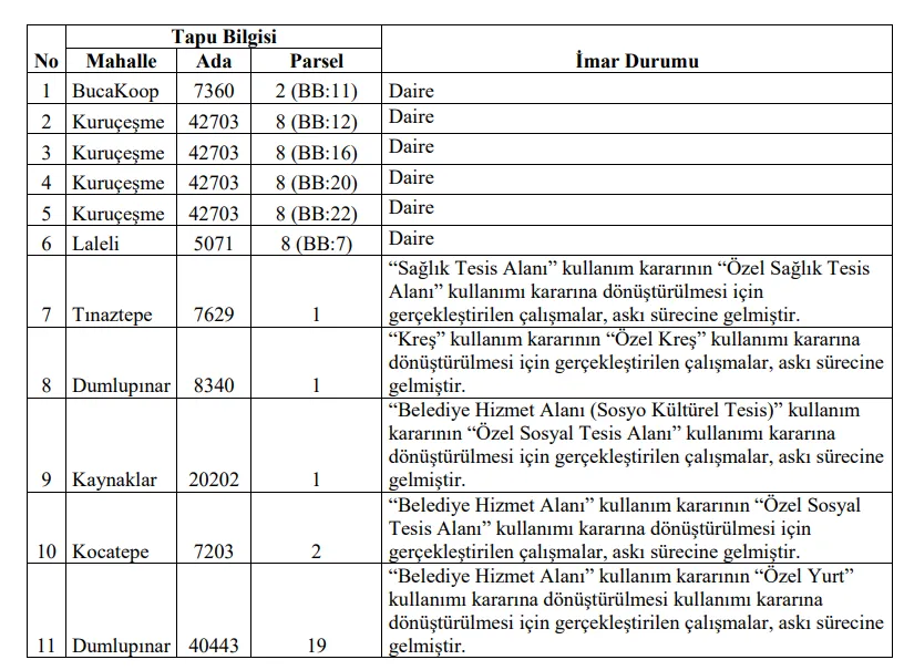Toplamda 11 taşınmaz satış gündeminde yer alıyor. Bunların bir bölümü konut niteliğinde dairelerden oluşurken, diğerleri sağlık tesisi, kreş, sosyal tesis, yurt ve belediye hizmet alanı gibi kamusal hizmetlere yönelik alanlardan oluşuyor.