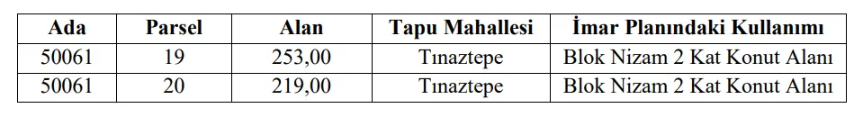 Belediye ayrıca 50061 Ada 19 ve 20 parselleri de değerlendirmeye aldı. Bu alanların imar planı Blok Nizam 2 Kat Konut Alanı olarak geçiyor. Taşınmazların satış veya trampa (mülkiyet değişimi) yöntemiyle belediye ve şirket borçlarına mahsup edilmesi hedefleniyor.