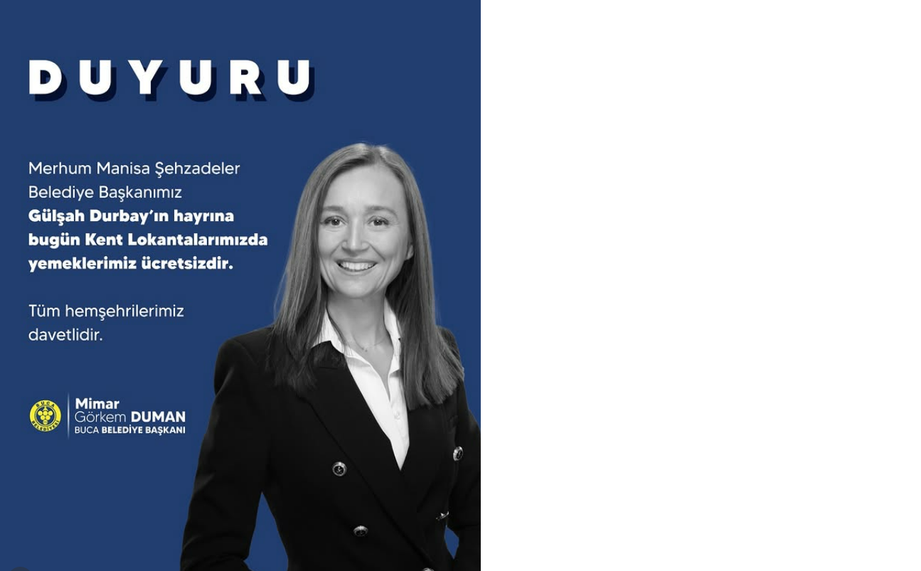 Belediyeden yapılan açıklamada, Durbay’ın hayrına Kent Lokantaları’nda gönül sofralarının kurulduğu ifade edildi. Açıklamada, “Vefatıyla bizleri derin bir üzüntüye boğan Manisa Şehzadeler Belediye Başkanımız Gülşah Durbay’ın hayrına bugün Kent Lokantalarımızda gönül soframızı kuruyoruz” denildi. Gün boyunca vatandaşlar, bu anlamlı etkinlikte bir araya gelerek merhum başkan için dualar edecek.
