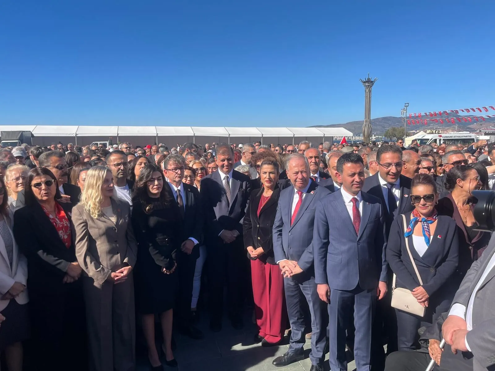 Cumhuriyet Halk Partisi (CHP) İzmir İl Başkanlığı, 29 Ekim Cumhuriyet Bayramı dolayısıyla Cumhuriyet Meydanı’nda tören düzenledi. CHP İzmir İl Başkanı Çağatay Güç, Kadın Kolları Başkanı Zahide Kurun ve Gençlik Kolları Başkanı Ruhsar Selis Çelik, törende Atatürk büstüne çelenk bıraktı. Saygı duruşu ve İstiklal Marşı’nın ardından düzenlenen törene, İzmir Büyükşehir Belediye Başkanı Dr. Cemil Tugay ve ilçe belediye başkanları da katıldı.