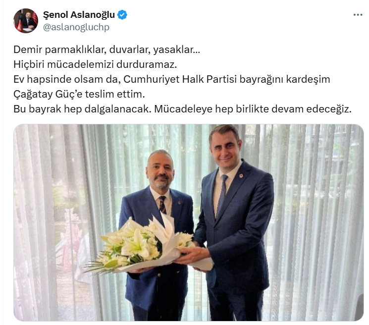 “Demir parmaklıklar, duvarlar, yasaklar… Hiçbiri mücadelemizi durduramaz. Ev hapsinde olsam da, Cumhuriyet Halk Partisi bayrağını kardeşim Çağatay Güç’e teslim ettim. Bu bayrak hep dalgalanacak. Mücadeleye hep birlikte devam edeceğiz.”