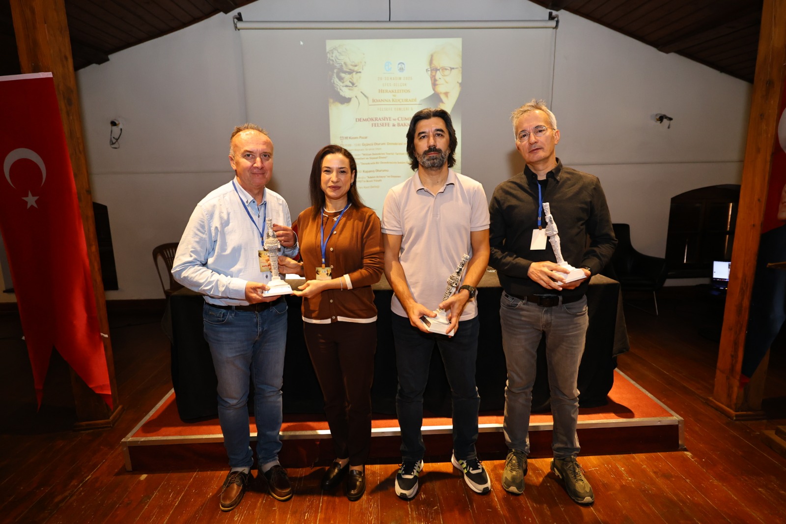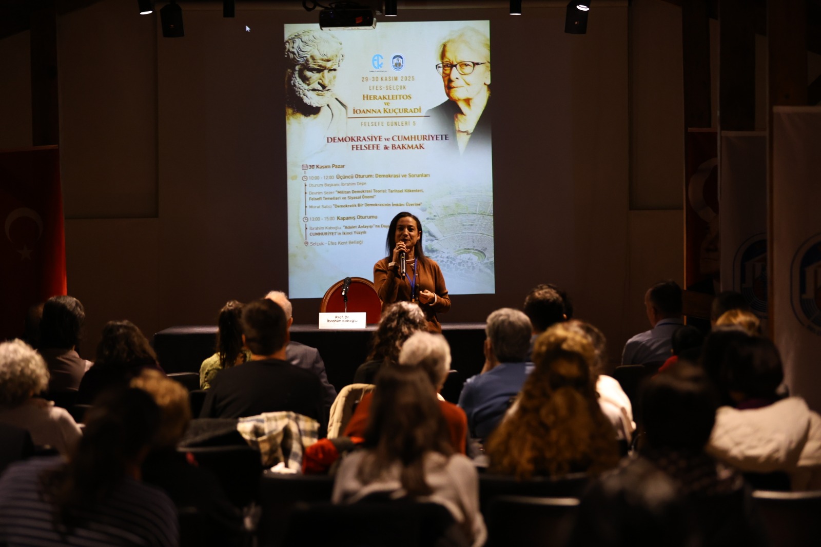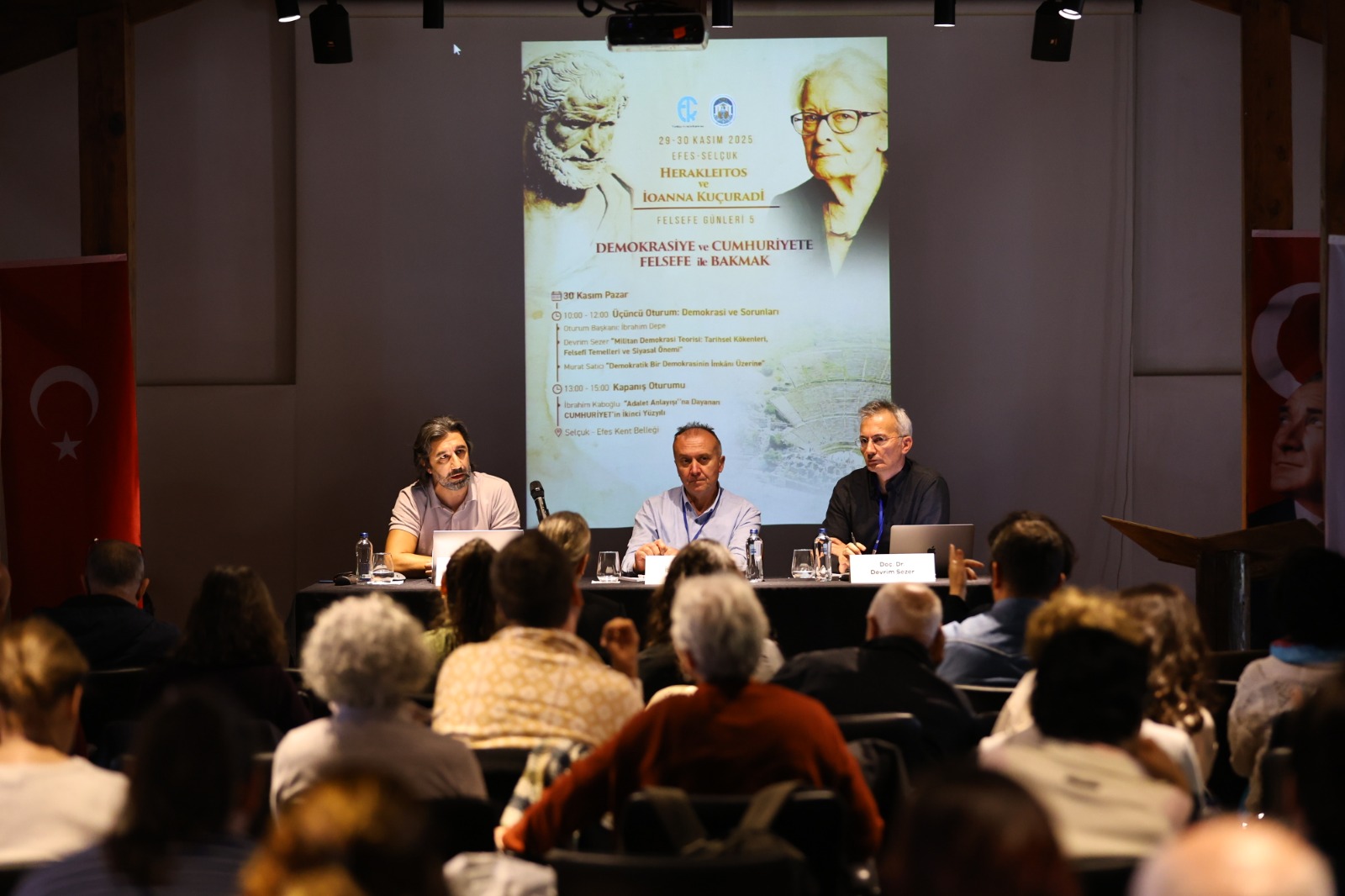 Selçuk Efes Kent Belleği’nde gerçekleşen etkinliğin ikinci gününde, Doç. Dr. Devrim Sezer ve Doç. Dr. Murat Satıcı “Demokrasi ve Sorunları” başlığı altında katılımcılara farklı bakış açıları sundu. Felsefeciler, demokrasi kavramının teorik temellerini ve günümüzdeki sorunlarını tartışarak katılımcıların sorularını yanıtladı.