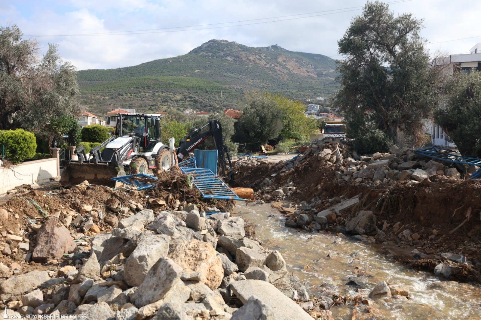 Ekipler, konutlar ve iş yerlerindeki suları tahliye ederken, dere yataklarını tıkayan ağaç dalları, kaya parçaları ve toprak birikintilerini temizliyor. Ayrıca, sel nedeniyle zarar gören dere yataklarının onarımı için İZSU ekipleri sahada çalışmalar yürütüyor.