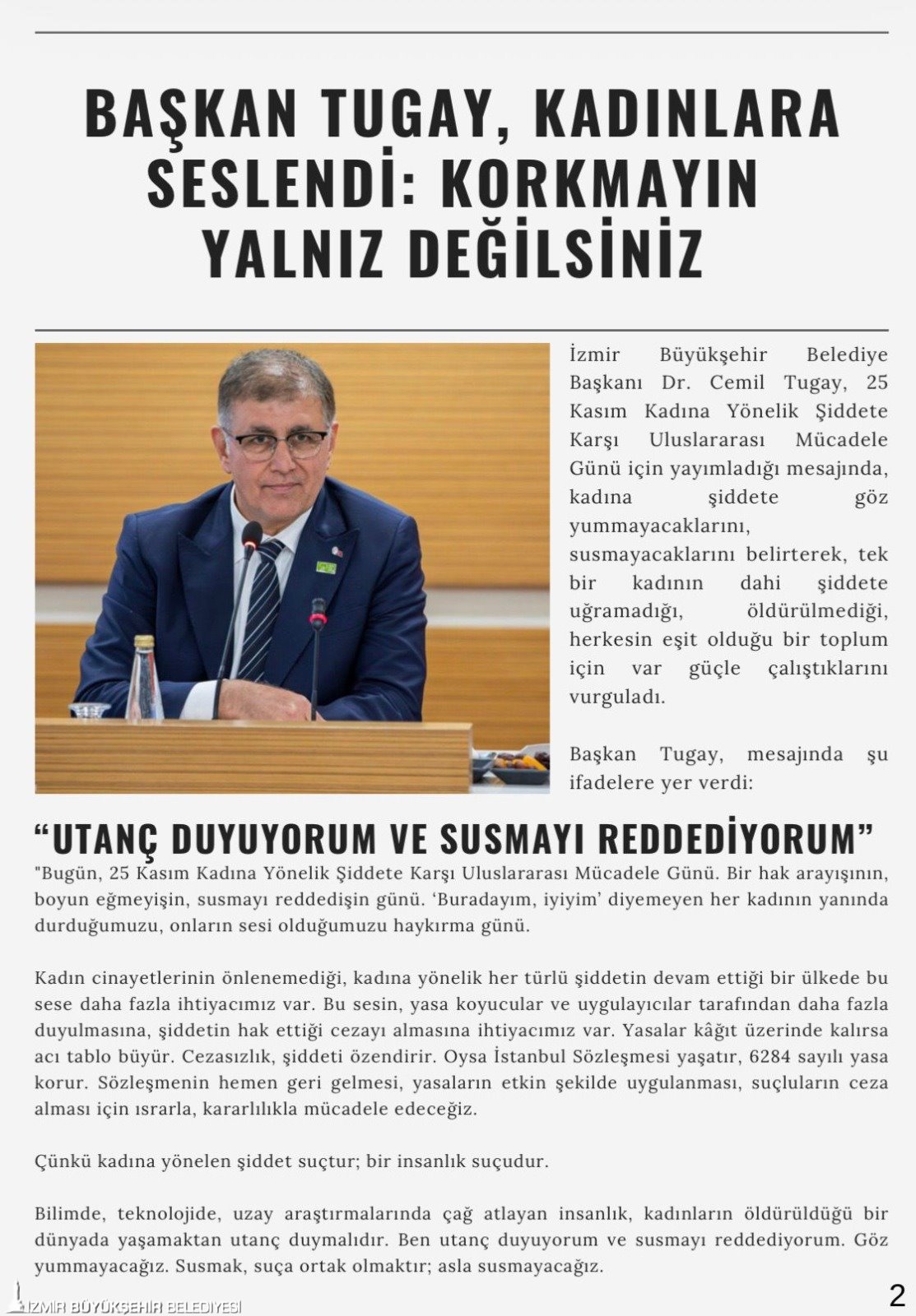 İzmir Büyükşehir Belediyesi’nin sosyal belediyecilik vizyonu doğrultusunda hazırladığı aylık e-bülten “Hep Birlikte İzmir”in kasım sayısı yayımlandı. Bülten, Kadın ve Aile Hizmetleri Dairesi Başkanlığı’nın ay boyunca gerçekleştirdiği çalışmaların tamamını kolay erişilebilir bir formatla okurlara ulaştırıyor.
