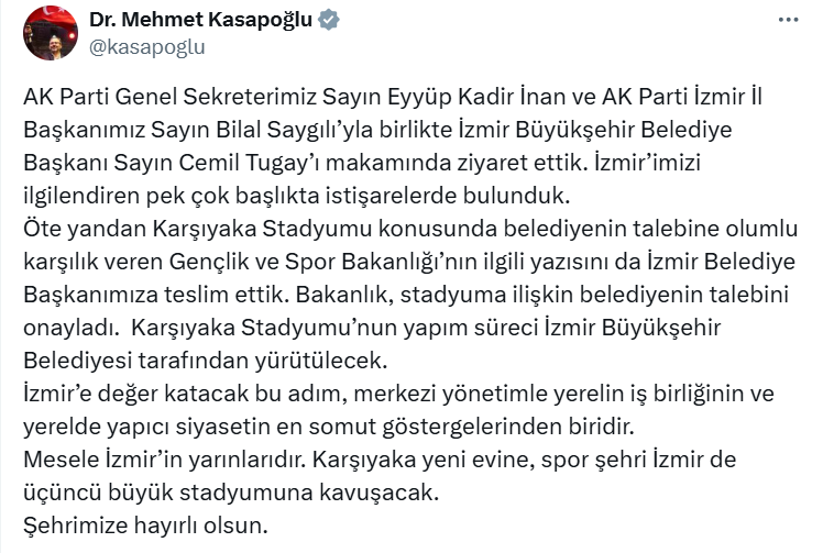 AK Parti İzmir Milletvekili Dr. Mehmet Kasapoğlu, Genel Sekreter Eyyüp Kadir İnan ve İl Başkanı Bilal Saygılı, İzmir Büyükşehir Belediye Başkanı Cemil Tugay’ı makamında ziyaret etti. Ziyarette İzmir’i ilgilendiren çeşitli konular ele alındı ve Karşıyaka Stadyumu’nun yapım süreci masaya yatırıldı.