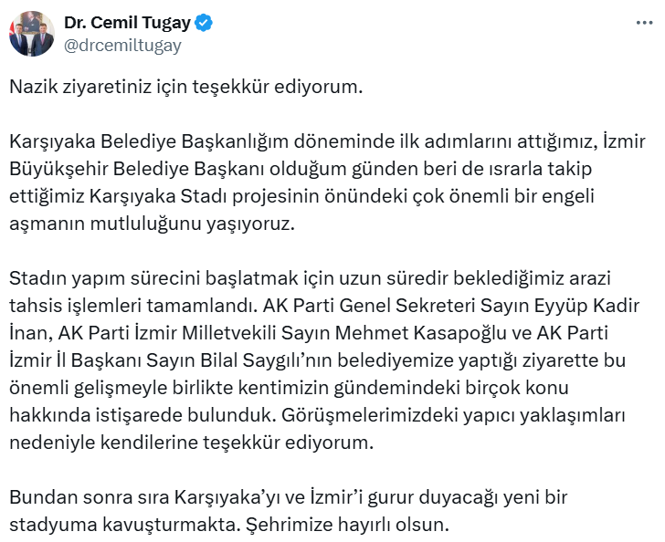 Başkan Tugay, nazik ziyaretten dolayı teşekkür ederek, “Karşıyaka Belediye Başkanlığım döneminde başlayan ve Büyükşehir Belediye Başkanı olduğum günden beri takip ettiğimiz projenin önündeki önemli engeli aşmanın mutluluğunu yaşıyoruz. Artık sıra Karşıyaka’yı ve İzmir’i gurur duyacağı yeni bir stadyuma kavuşturmakta” ifadelerini kullandı.