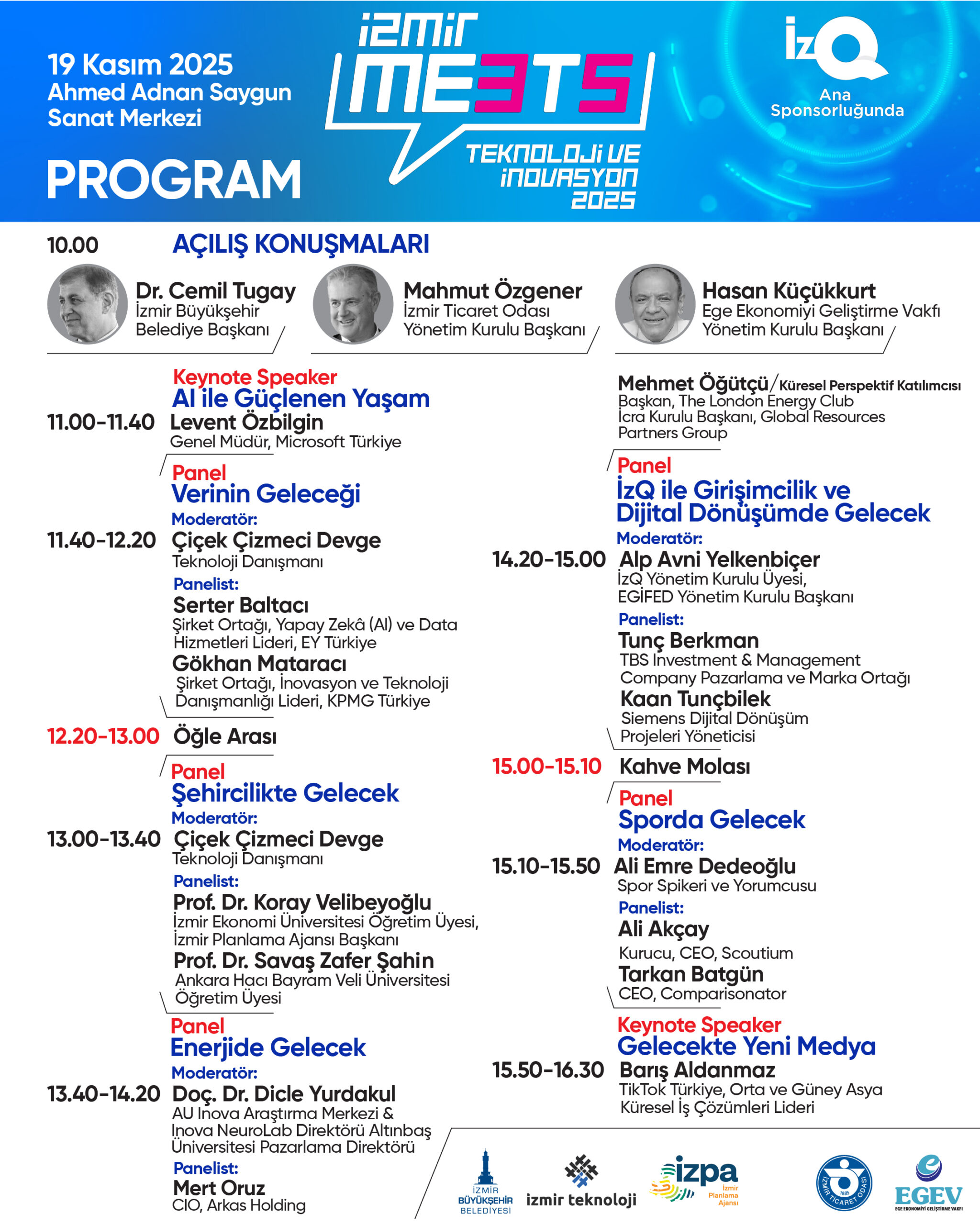 Microsoft Türkiye Genel Müdürü Levent Özbilgin, TikTok Türkiye Orta ve Güney Asya Küresel İş Çözümleri Lideri Barış Aldanmaz ve Global Resources Partners Group The London Energy Club İcra Kurulu Başkanı Mehmet Öğütçü gibi 16 önemli isim, etkinlik kapsamında İzmir’de sektör profesyonelleri ve girişimcilerle bir araya gelecek.