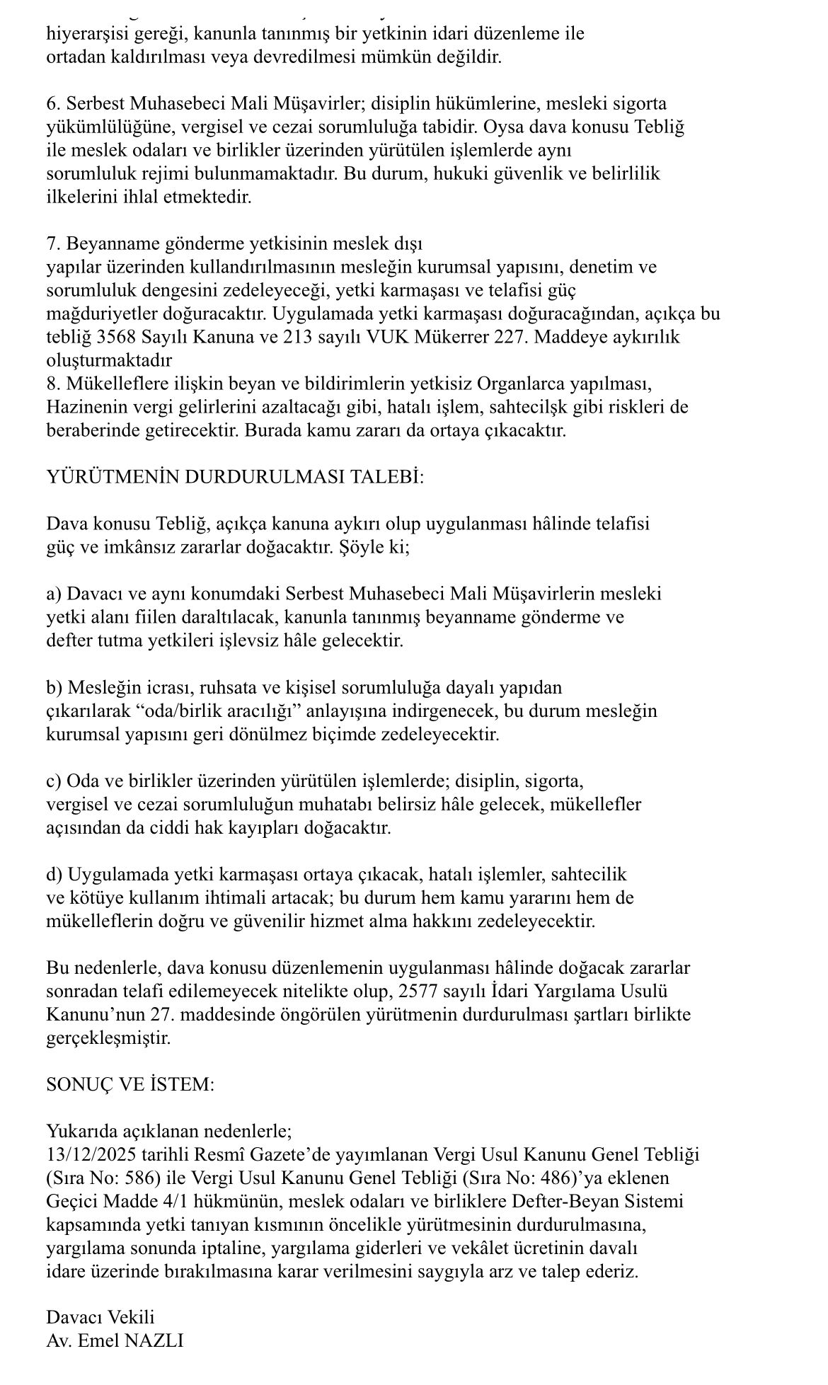 Dava konusu tebliğle, kanunla sadece meslek mensuplarına tanınan yetkilerin meslek icra etmeyen oda ve birlikler aracılığıyla kullanılmasının önünün açıldığını belirten Yaşar, bunun normlar hiyerarşisine aykırı olduğunu söyledi. Söz konusu düzenlemenin aynı zamanda verginin kanuniliği, hukuki güvenlik ve belirlilik ilkelerini de ihlal ettiğini dile getirdi.