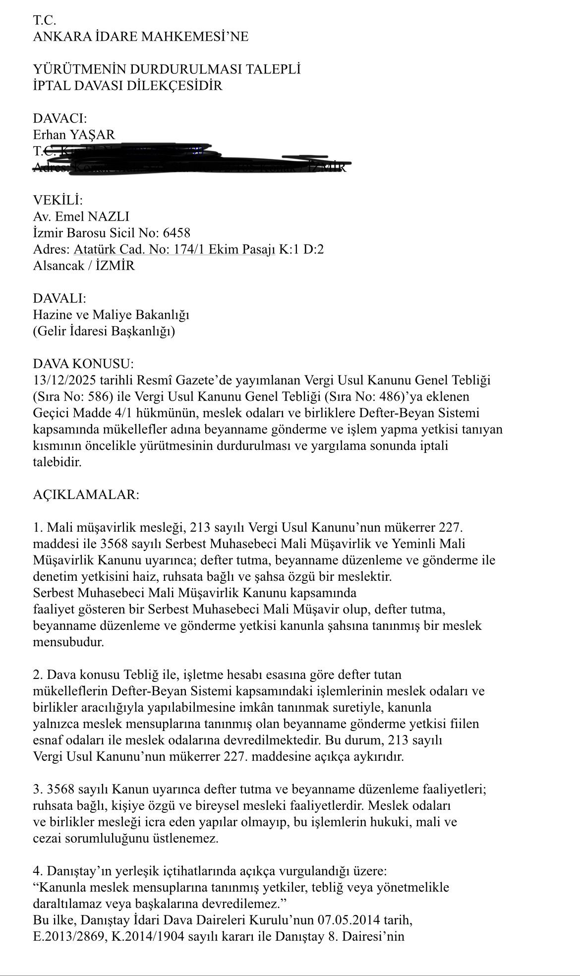 Açıklamada, söz konusu düzenlemenin kanuna aykırı olduğu ve uygulanması hâlinde telafisi güç zararlar doğuracağı gerekçesiyle Ankara İdare Mahkemesi nezdinde yürütmenin durdurulması talepli iptal davası açıldığı bilgisi paylaşıldı.
