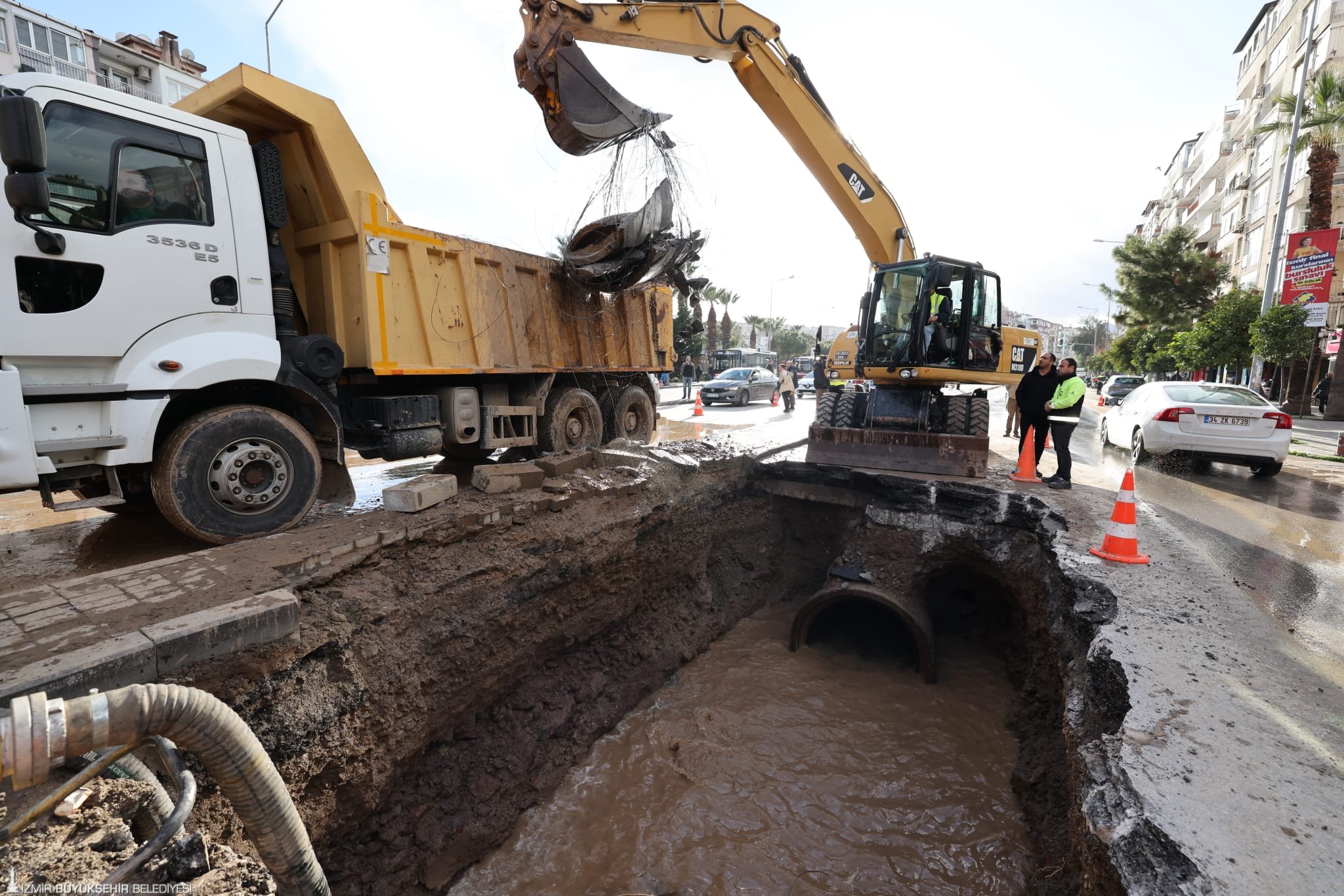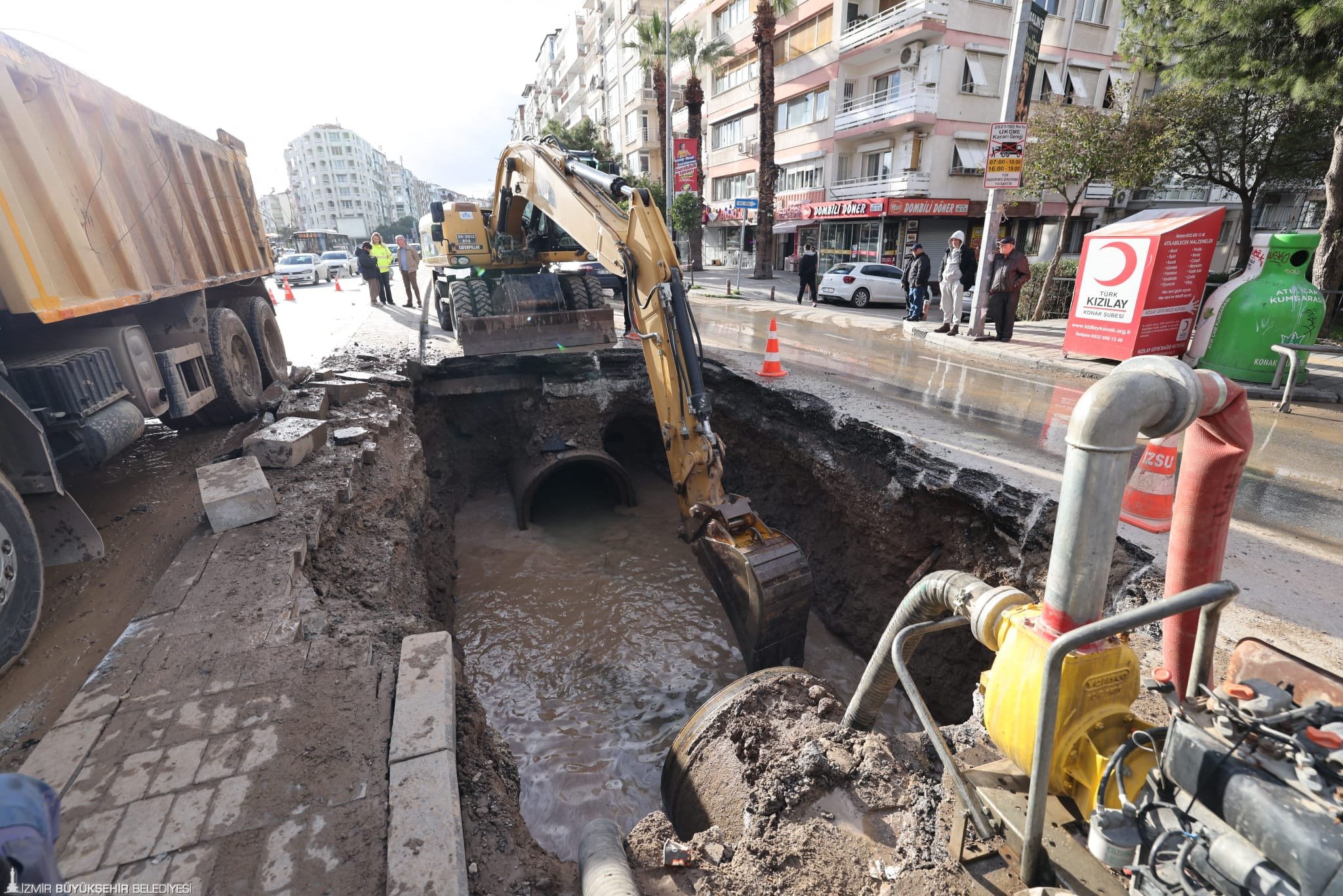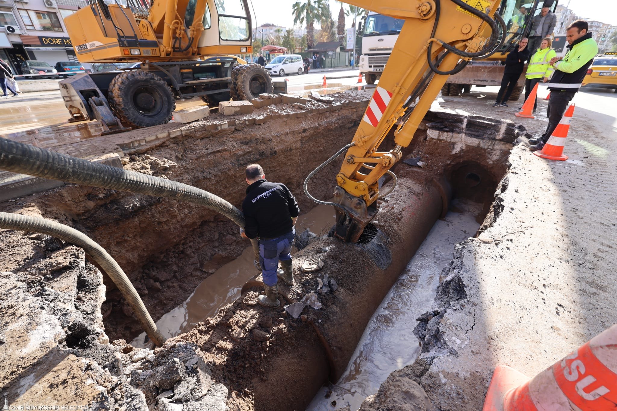 İZSU Genel Müdürlüğü’nden yapılan açıklamaya göre, Konak ilçesi İnönü Caddesi ile 200 Sokak kavşağında öğle saatlerinde ana isale hattında arıza meydana geldi. Kentin içme suyu iletiminde kritik öneme sahip 1,4 metre çapındaki beton içme suyu borusunda oluşan arızanın, boru birleşim noktasından kaynaklandığı tespit edildi. Arızanın giderilmesi ve daha büyük altyapı sorunlarının önüne geçilmesi amacıyla hat kontrollü şekilde devre dışı bırakıldı.