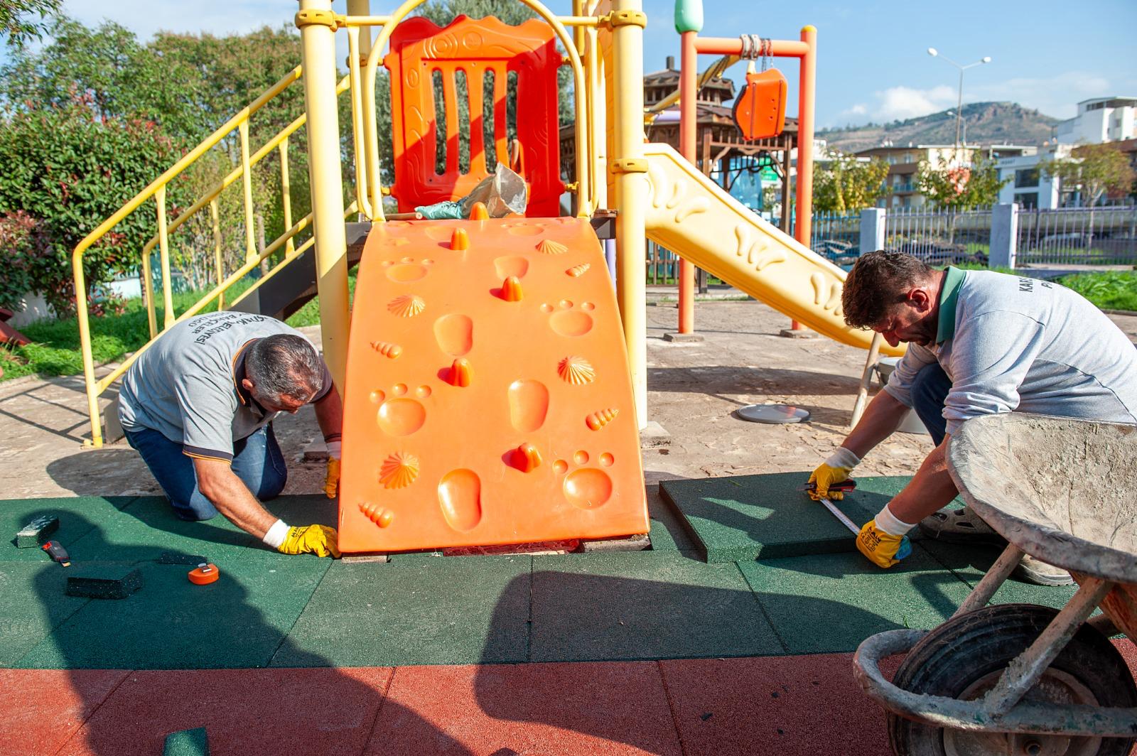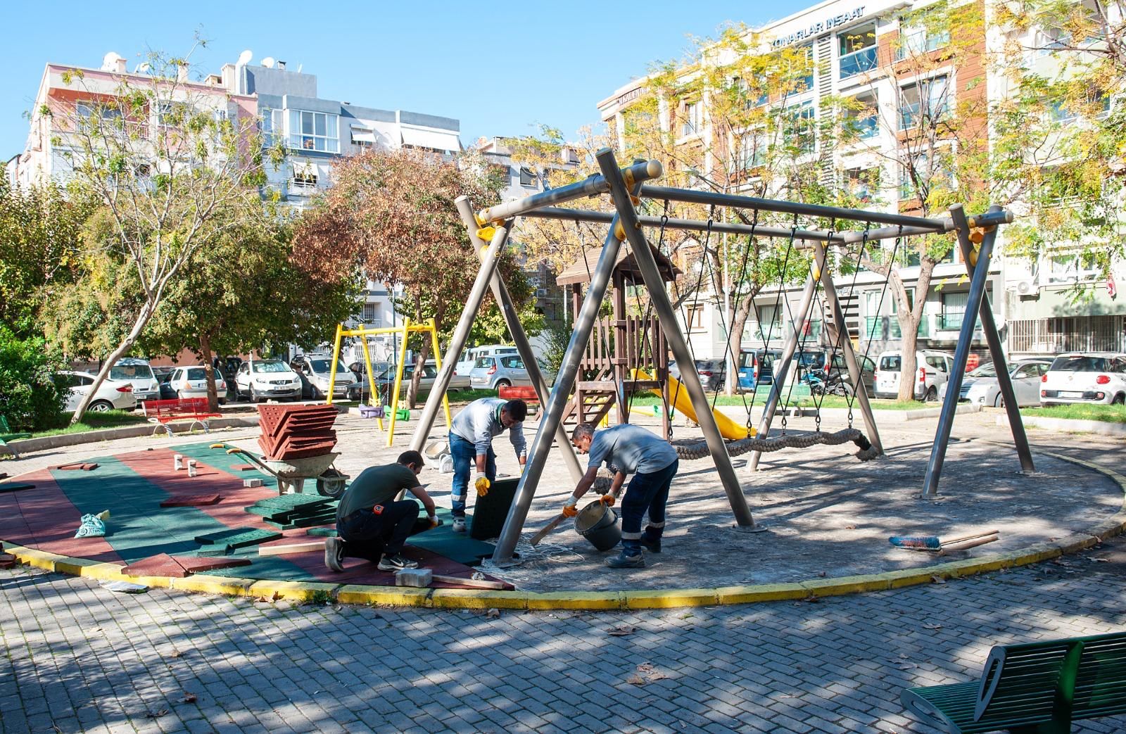 Park ve Bahçeler Müdürlüğü ekipleri, ihtiyaç tespiti sonrası belirlenen noktalarda kapsamlı yenileme çalışmaları gerçekleştirdi. Sebahattin Taşkıran Parkı, Osmanbey Parkı, Karşıyaka’nın Filizleri Anaokulu, Doğa Parkı, Kardelenler Anaokulu ve Tahir Bor Parkı’nda zeminler tamamen yenilendi. Bu alanlarda toplam 1.010 metrekarelik bölüm güvenlik standartlarına uygun 4 cm kalınlığında kauçuk zemin ile kaplandı.