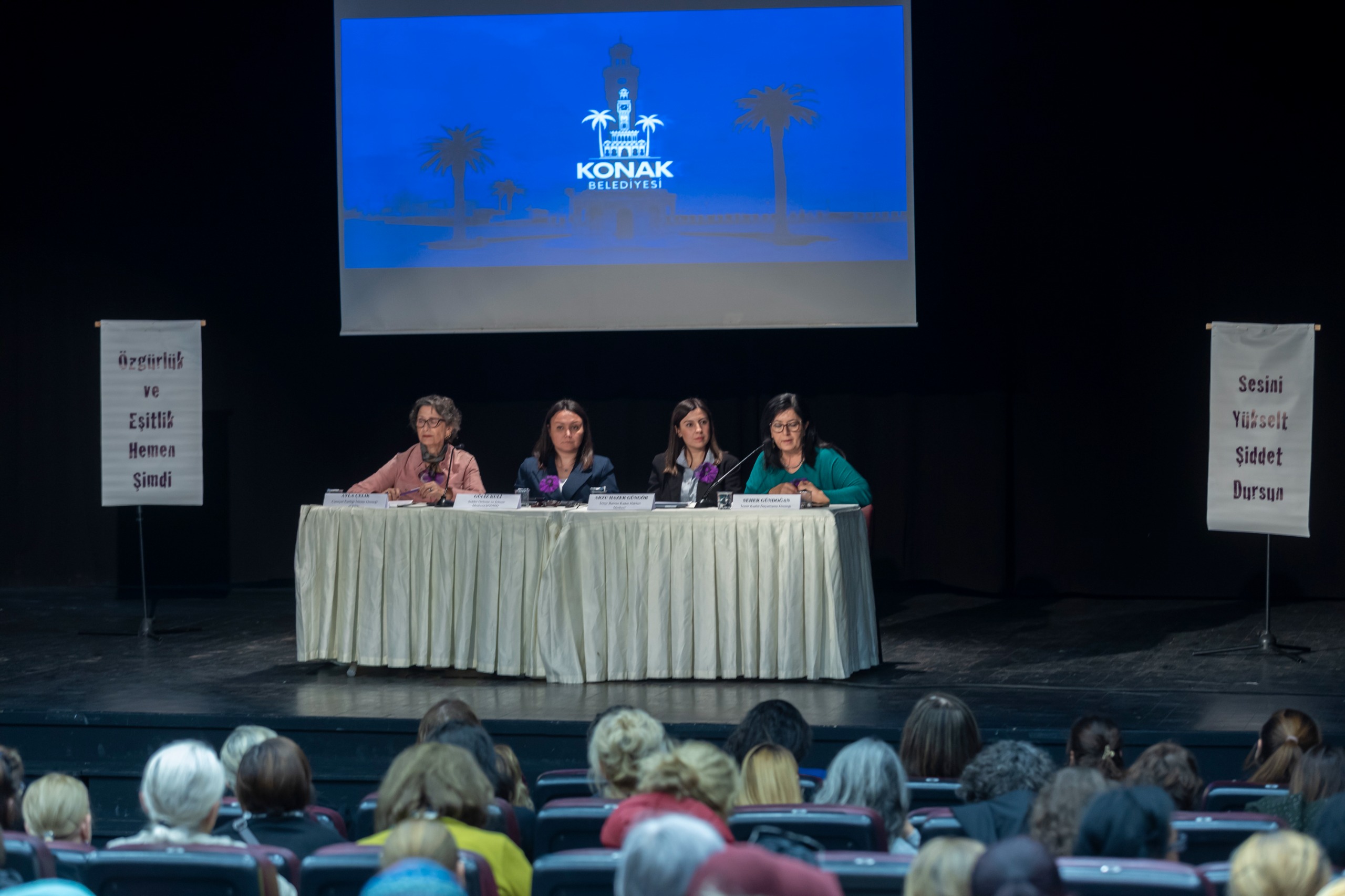 Konak Belediyesi’nin Dr. Selahattin Akçiçek Kültür Merkezi’nde düzenlenen panel, alanında uzman isimleri bir araya getirdi. Moderatörlüğü Cinsiyet Eşitliği İzleme Derneği İzmir İl Koordinatörü Ayla Çelik yaptı. İzmir Şiddet Önleme ve İzleme Merkezi (ŞÖNİM) Müdürü Sosyal Hizmet Uzmanı Güliz Kuli, İzmir Kadın Dayanışma Derneği’nden Psikolog Seher Gündoğan ve İzmir Barosu Kadın Hakları Merkezi’nden Avukat Arzu Hazer Güngör konuşmacı olarak katıldı.