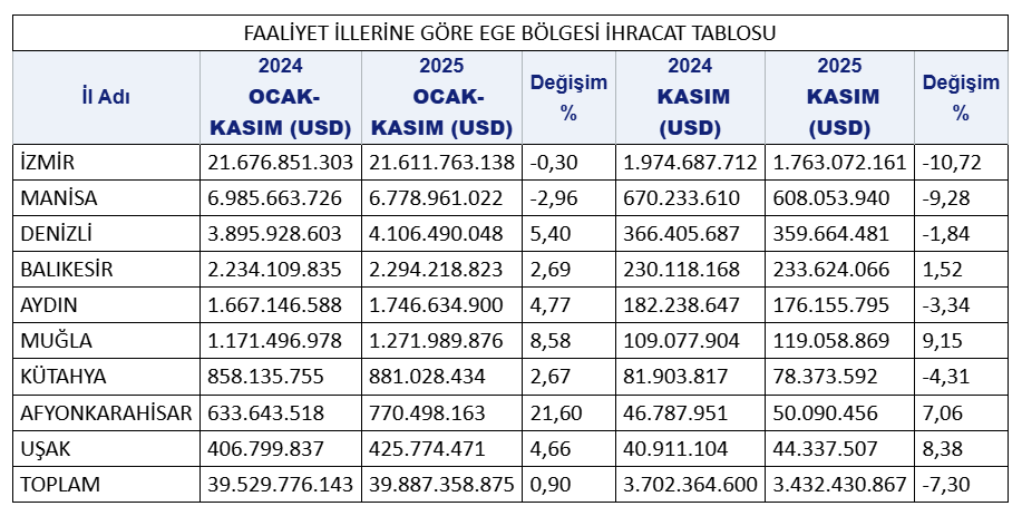 Afyonkarahisar, kasımda yüzde 7’lik artışla 50 milyon dolara yükseldi. 11 aylık dönemde ise yüzde 21,6 artışla 770 milyon dolara ulaştı ve Ege’de çift haneli artış gerçekleştiren tek il oldu. Uşak, kasımda yüzde 8,4’lük artışla 44,3 milyon dolara çıkarken, 11 aylık ihracatı yüzde 4,7 artışla 425,7 milyon dolara ulaştı.