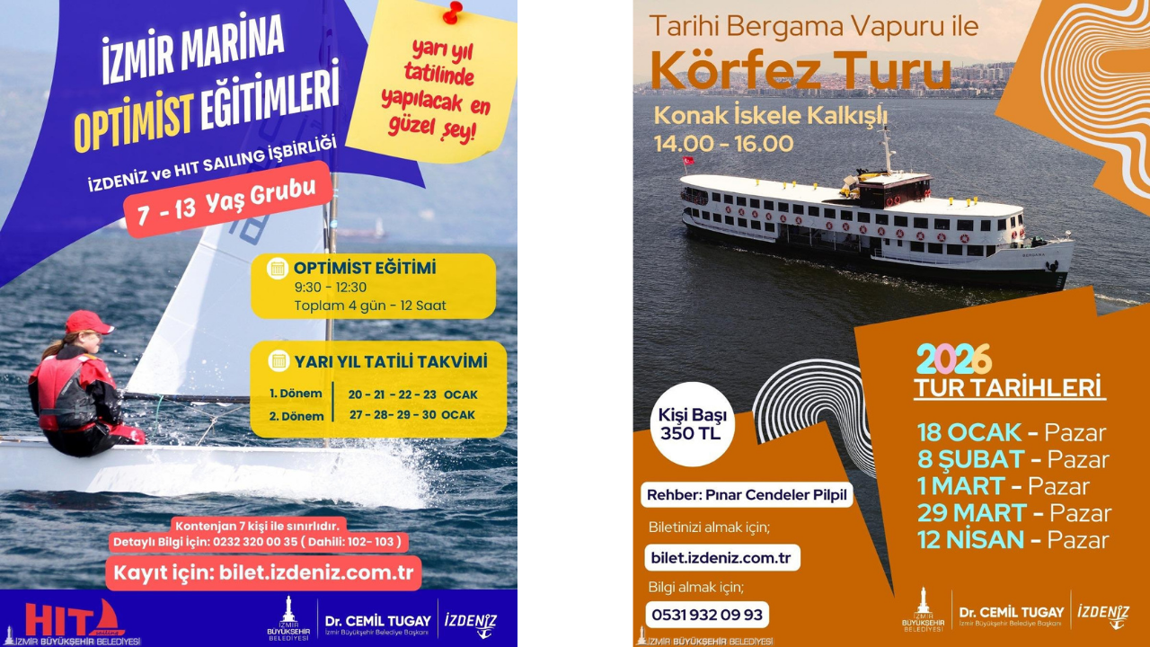 Tarihi Bergama Vapuru ile gerçekleştirilen rehberli İzmir Körfezi Turu, kentin denizden hikâyesini keşfetmek isteyenler için özel bir deneyim sunuyor. Turlar; 18 Ocak, 8 Şubat, 1 Mart, 29 Mart ve 12 Nisan 2026 tarihlerinde 14.00–16.00 saatleri arasında yapılacak.