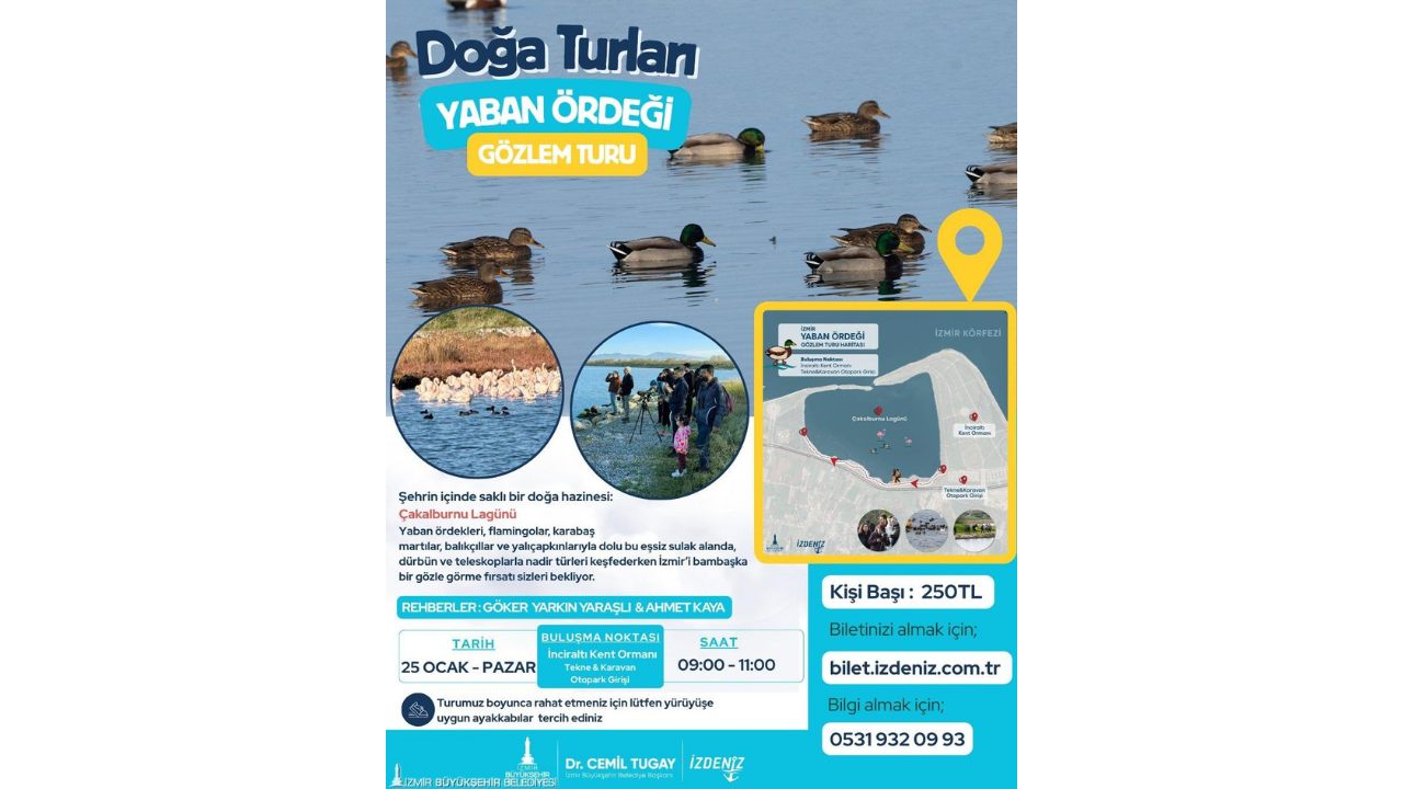 Doğaseverler için düzenlenen Yaban Ördeği Gözlem Turu, 25 Ocak 2026 Pazar günü 09.00–11.00 saatleri arasında Çakalburnu Lagünü’nde yapılacak. İnciraltı Kent Ormanı’ndan başlayacak turun ücreti 250 lira, kontenjanı 30 kişi olacak.